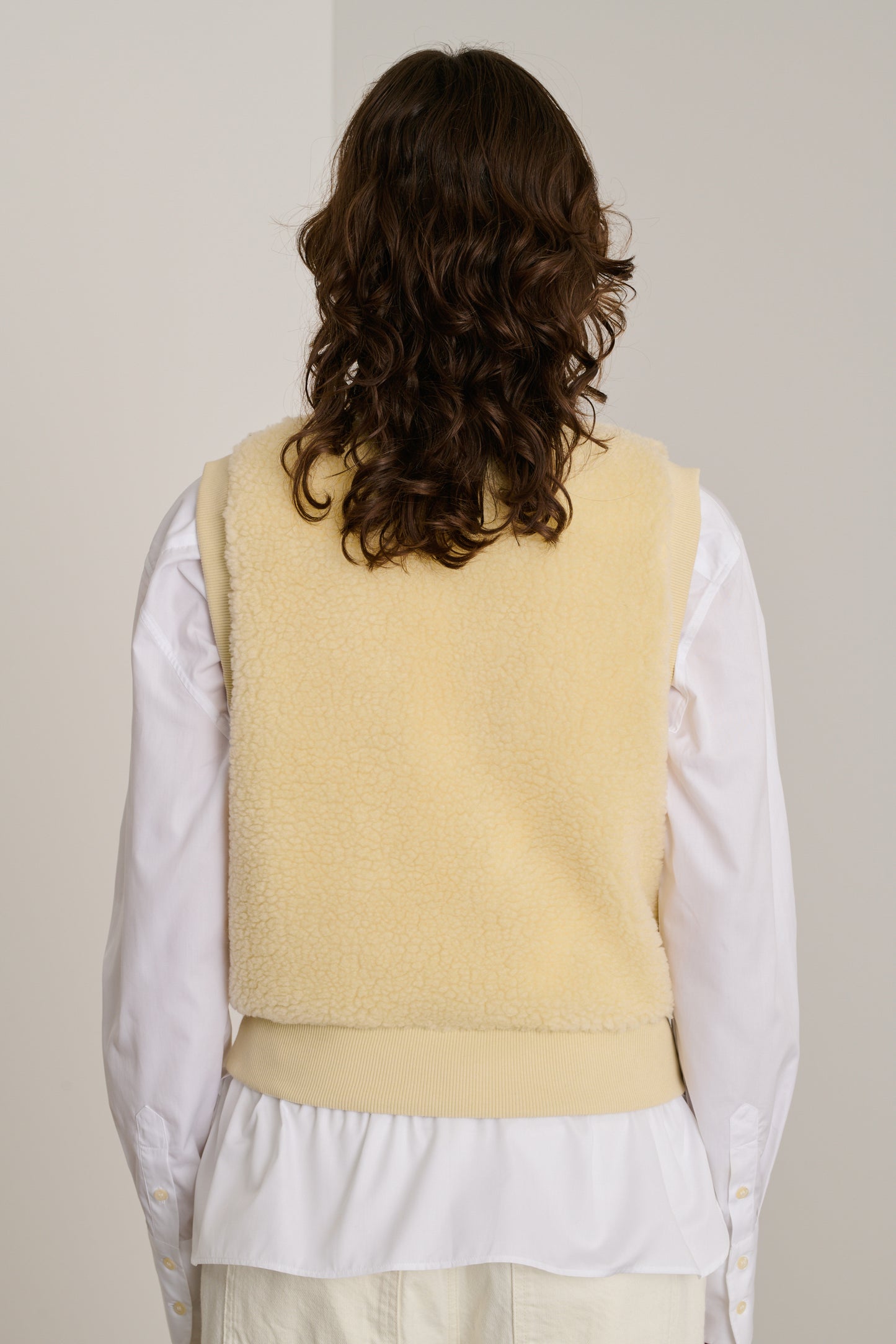 BAILA is a sleeveless sweatshirt made from faux fur. Its straight cut, subtly cinched at the hem, creates an elegant silhouette while providing freedom of movement. Perfect for layering or wearing on its own, this sweatshirt combines warmth and style.